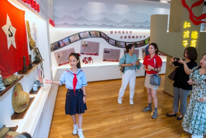 7月25日,湖北省宜昌市實驗小學“紅領巾講解員”肖菡西同學為采訪報道組介紹“紅孩子”德育加油站的陳設。新華網(wǎng) 鐘奕 攝