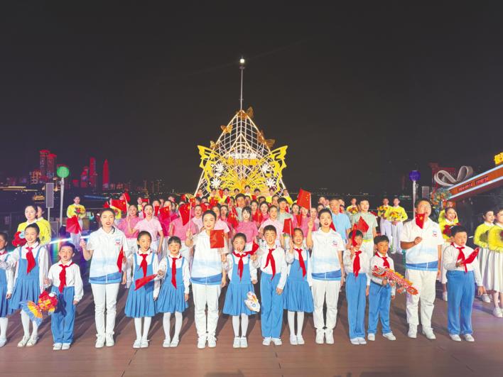 長江榮耀號甲板上,十堰市丹江口市“小水滴”志愿者代表們和歌手、演員、小學生們齊聲合唱《我的祖國》。