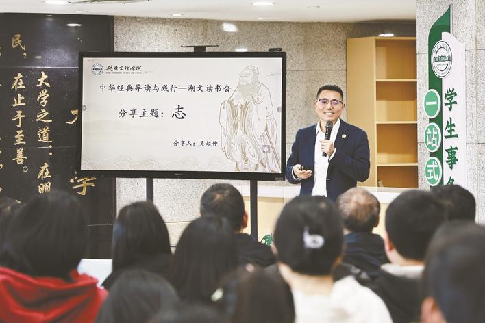 “夫君子之行,靜以修身,儉以養(yǎng)德。非淡泊無以明志,非寧?kù)o無以致遠(yuǎn)……”近日,在湖北文理學(xué)院“一站式”學(xué)生社區(qū)“德園”,該校黨委書記吳超仲以“志”為題,為師生作國(guó)學(xué)經(jīng)典導(dǎo)讀。導(dǎo)讀中,他結(jié)合諸葛亮躬耕隴畝的典故,闡釋“淡泊明志”的精神內(nèi)核,引導(dǎo)師生從典籍中感悟修身治學(xué)之道。
