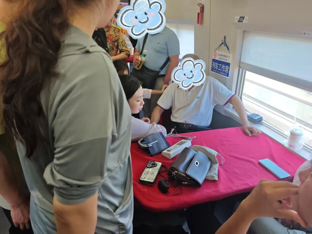 大家撥開圍觀的人群,只見一位老年男性乘客臉色蒼白地靠在座椅上,呼吸略顯急促。“您別急,我是醫生,這些是我的學生。”潘金戈一邊安撫患者,一邊迅速向家屬了解情況。得知老人患有高血壓、冠心病、Ⅱ型糖尿病等多種基礎病時,她先是向患者、家屬及列車乘務員說明團隊的專業資質,在征得三方同意后,立刻安排學生分工合作。他們有的拿出隨身攜帶的急救監測設備,有的輕聲與家屬溝通了解患者既往病史,有的配合列車乘務員疏導周圍旅客。