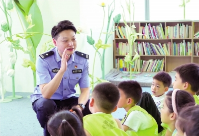 武漢市公安局江岸區分局刑事偵查大隊民警潘黎走進暑托班,為孩子們講授反詐和安全知識。